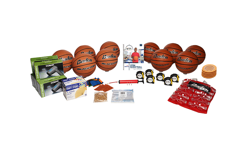 Each STEM Basketball kit comes with one (1) STEM Basketball Curriculum Manual, five (5) indoor basketballs, five (5) outdoor basketballs, five (5) 25’ tape measures, five (5) hair dryers, five (5) calipers, twelve (12) protective eyewear, five (5) cut ball swatches – indoor, five (5) cut ball swatches – outdoor, five (5) digital timers, five (5) rolls of masking tape, one thousand (1000) craft sticks, one hundred (100) plastic spoons, five-hundred (500) rubber bands, two (2) ball bags, one (1) ball pump, one (1) set of inflation needles.